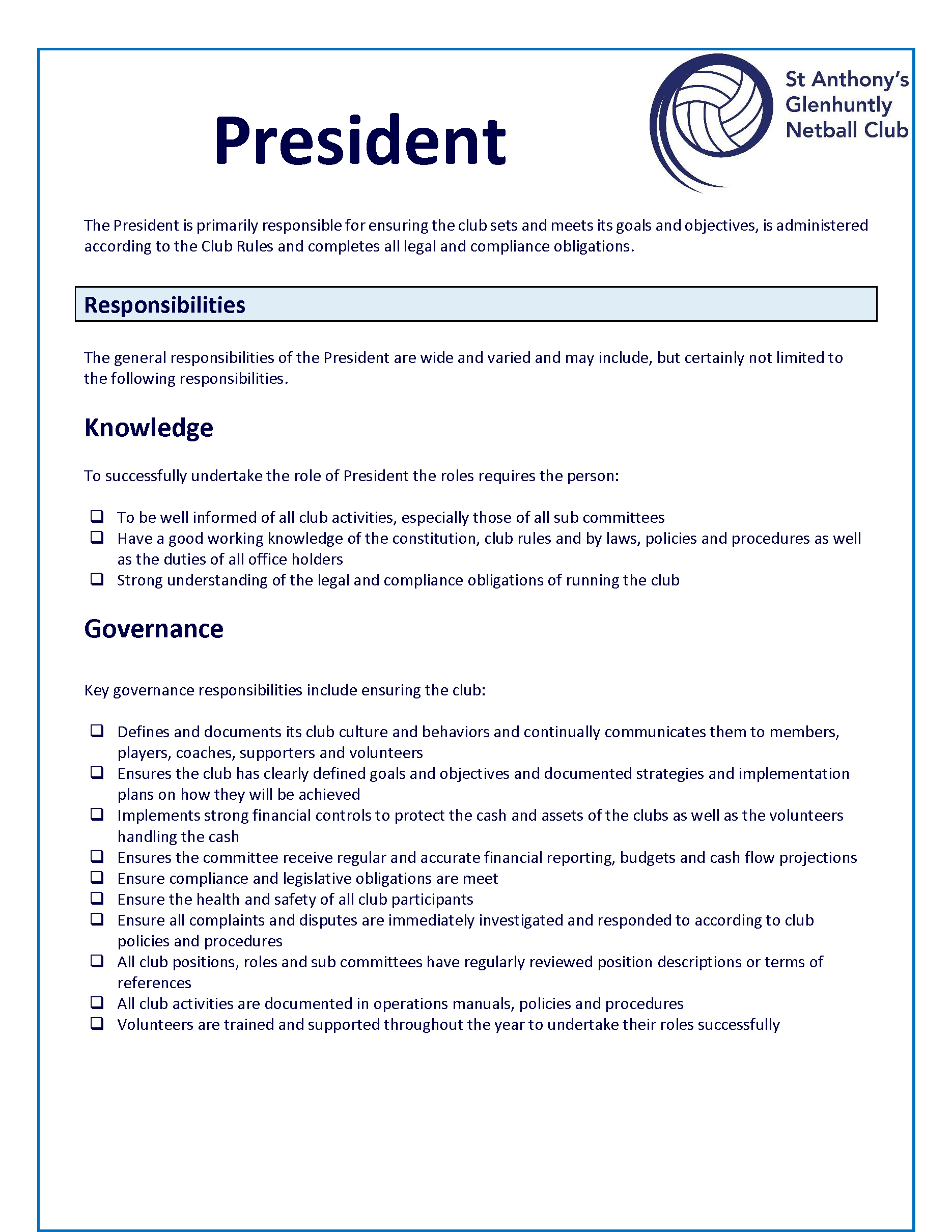 general club correspondence, responding to any correspondence as required. They are the club's point of contact for key stakeholders
