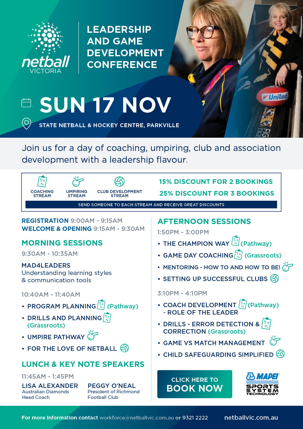 Netball Victoria are holding a fantastic Conference on Sunday 17th November which is an awesome professional development opportunity for coaches, umpires, clubs and administrators too. There are practical and information sessions, including hearing from the Diamonds coach Lisa Alexander! See flyer for more information and you can book here: http://events.netballvictoria.conference