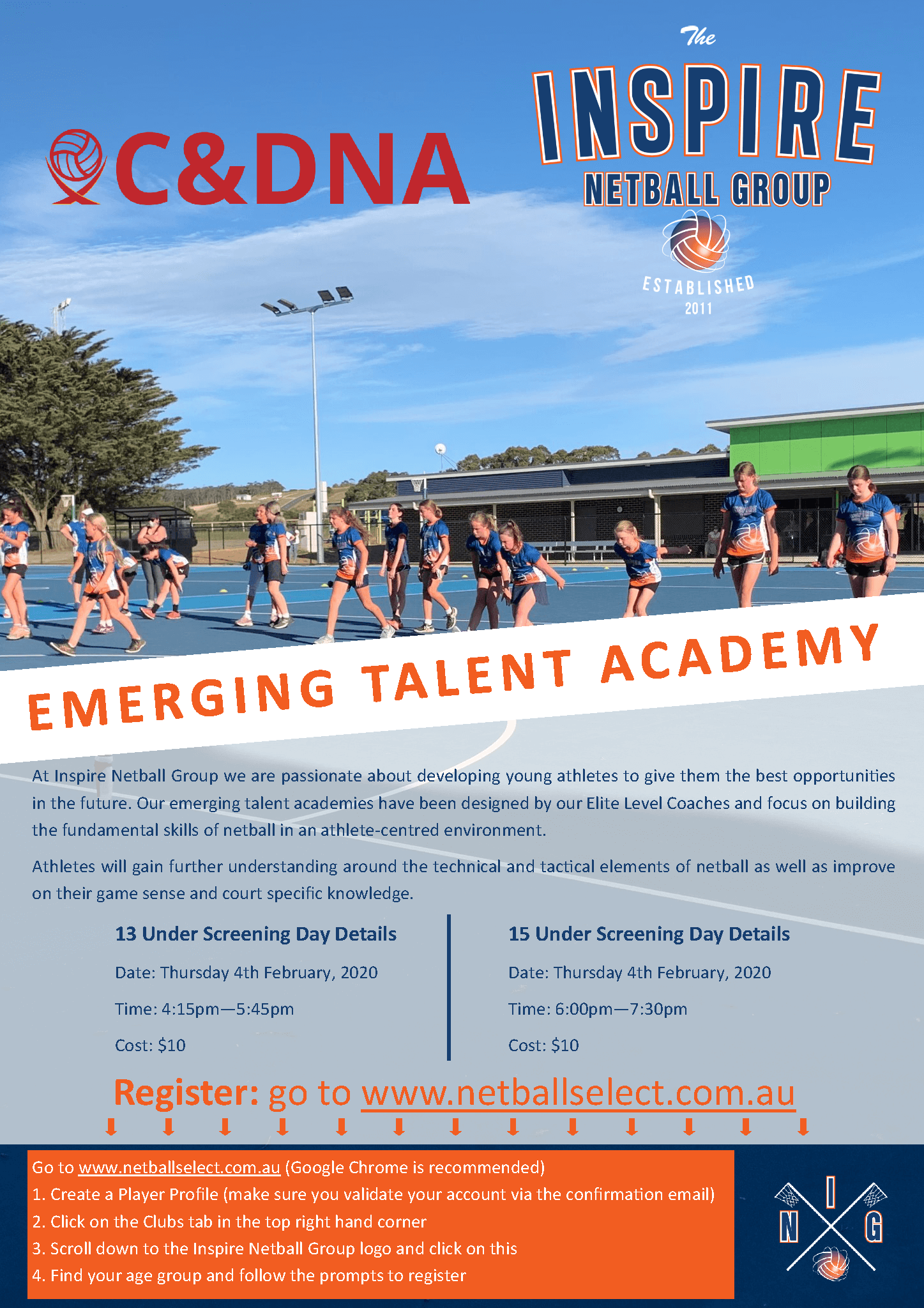 Please pass onto all of your members aged between 11-15 the opportunity to attend the screening for the CDNA Emerging Talent Academy, run by Inspire Netball Group. It is aimed at players who are not in our Rep program and will run over the whole of this year. It’s an awesome opportunity for everyone. The flyer is attached.